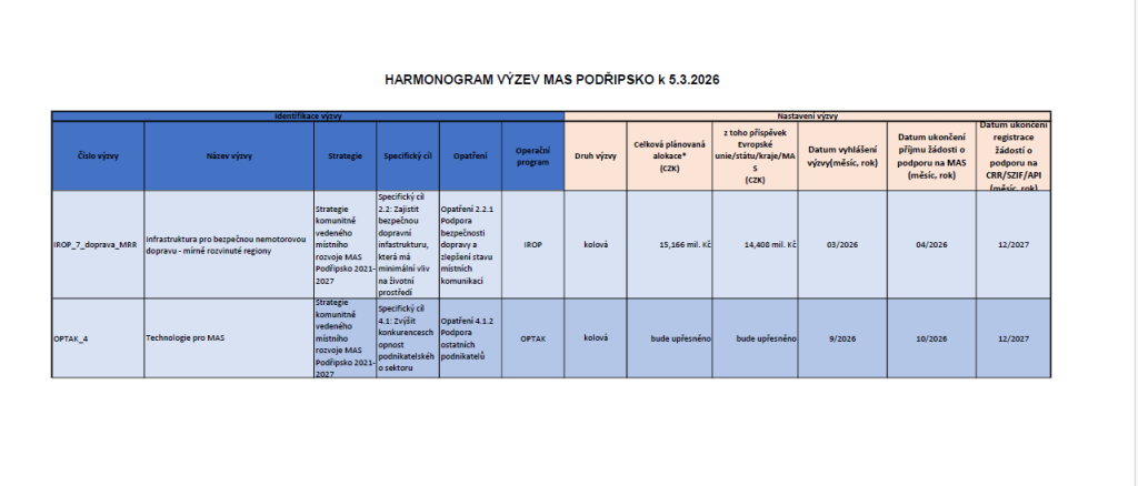 Výzvy MAS HARMONOGRAM VÝZEV MAS PODŘIPSKO 1.6.2023 6.3.2026 Harmonogram plánovaných výzev MAS Podřipsko Harmonogram výzev (platný od 6. 3. 2026) 1 soubor(y) 46.98 KB Stáhnout Harmonogram výzev MAS Podřipsko k 11. 6. 2025 1 soubor(y) 68.20 KB Stáhnout Harmonogram výzev MAS k 11. 9. 2024 1 soubor(y) 693.34 KB Stáhnout Share on Facebook Share Share on TwitterTweet Send email Mail Print Print Výzva č. 7 – Podpora komunitního života na Podřipsku 2023 Harmonogram výzev MAS Podřipsko k 27. 3. 2024 Napsat komentář Zrušit odpověď na komentářVaše e-mailová adresa nebude zveřejněna. Vyžadované informace jsou označeny *CommentName* Email* Website Δ